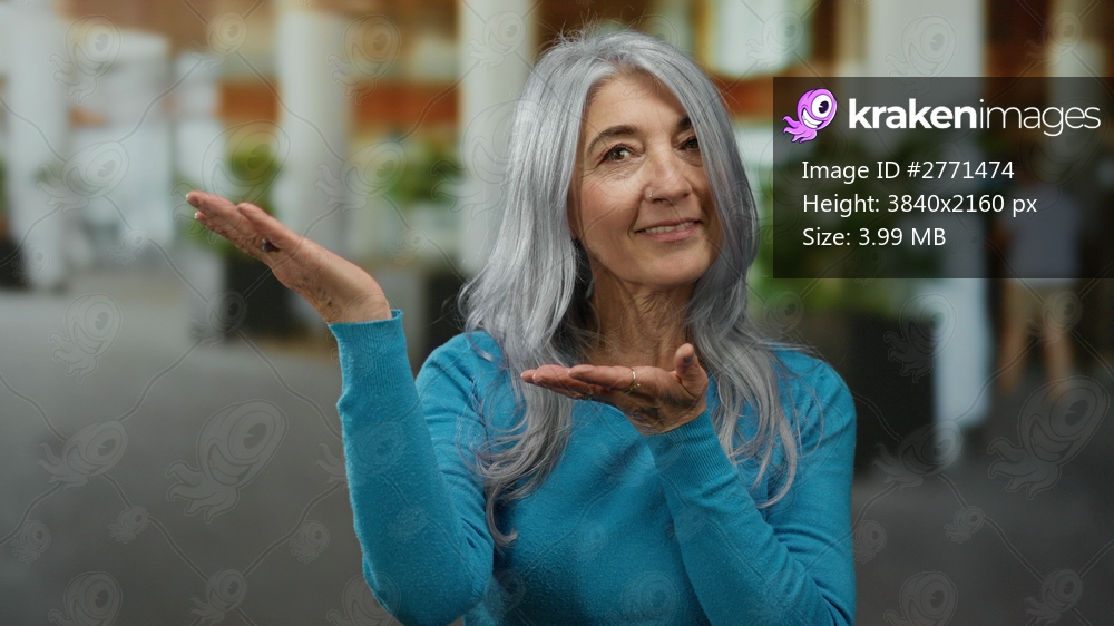 Woman smiling extends hands on urban street highlighting grey hair vibrant blue sweater outdoor casual happy atmosphere