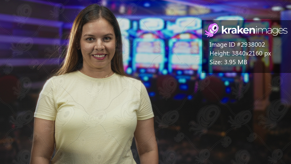 Woman smiling with eyes closed, face visible standing by brightly lit slot machines in a casino building; luck contentment.