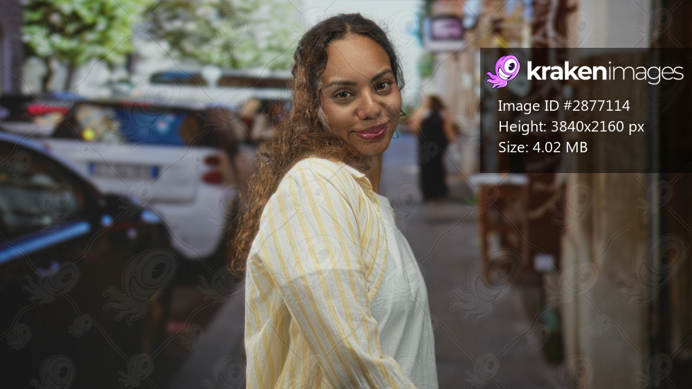 Woman smiling with eyes closed and head tilted on a street in sunlight, wearing striped shirt; joy freedom ease play.
