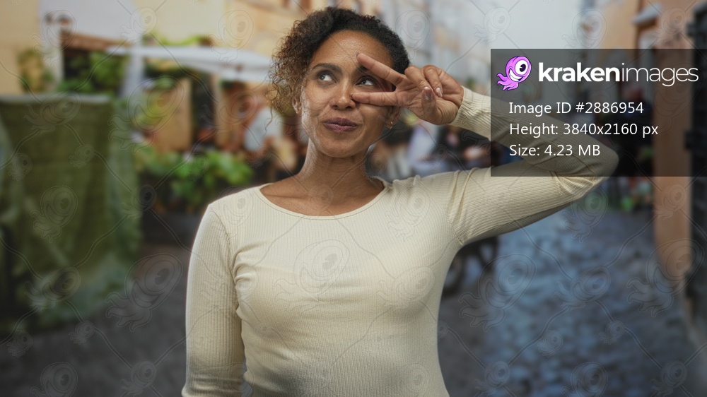 Woman smiling with eyes closed making peace sign in front of busy cobblestone street market; joyful travel memory.