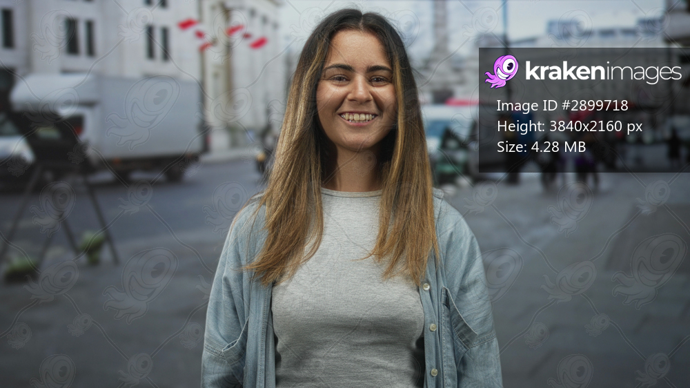 Woman smiling with eyes closed showing face and teeth in casual denim shirt on busy city street with vans and pedestrians; happiness calm optimism.