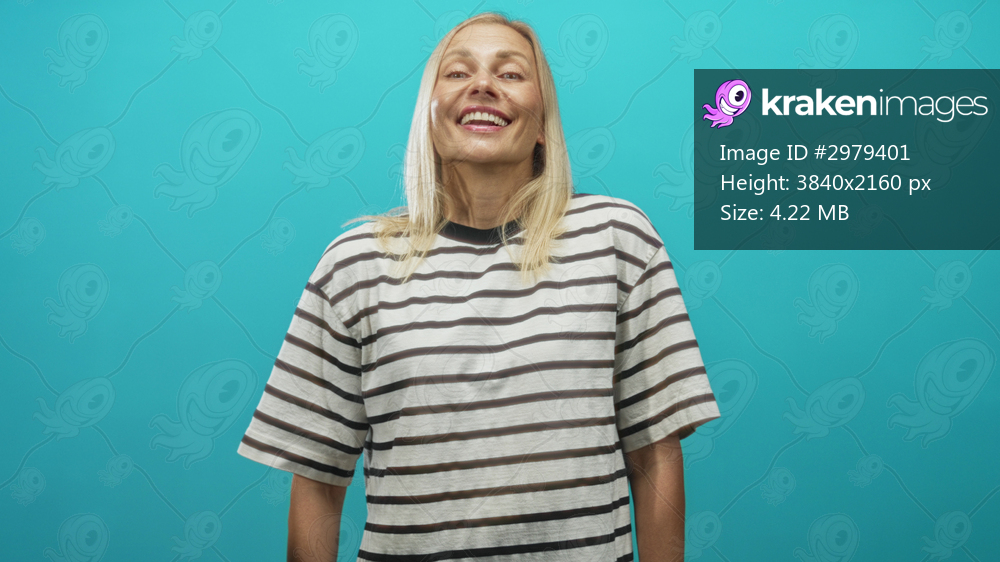 Woman smiling with eyes closed, showing teeth and tilting head, blonde wearing striped t-shirt against turquoise studio backdrop; joy warmth openness.