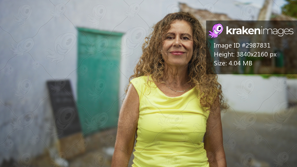 Woman smiling with eyes closed, wearing sleeveless yellow top and necklace on a narrow whitewashed street; serene travel leisure memory.