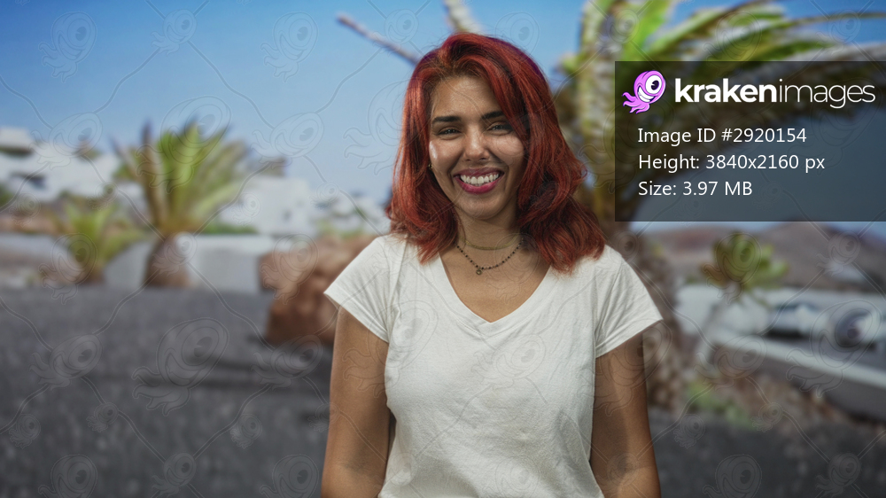 Woman smiling with face and bare arms visible on street by palm tree and parked cars under blue sky; happiness travel vacation casual.