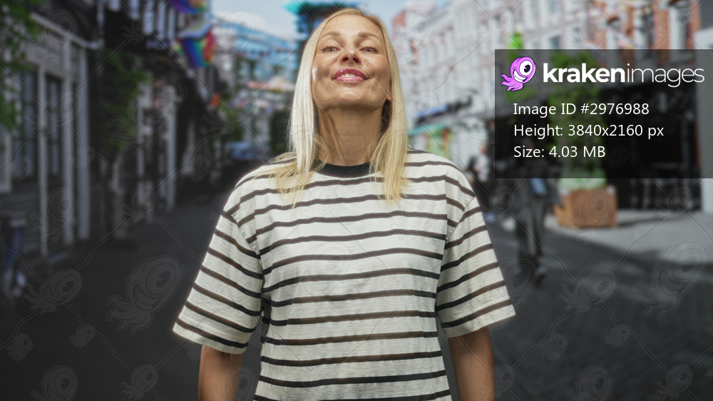 Woman smiling with face forward and eyes closed in a striped t-shirt, standing on a pedestrian city street near cafes, planters and a flag; serenity.
