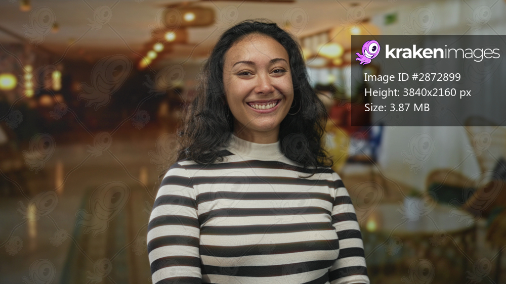 Woman smiling with face and head tilt, eyes closed, wearing striped top in hotel building lobby with warm lights and chairs; contentment ease.