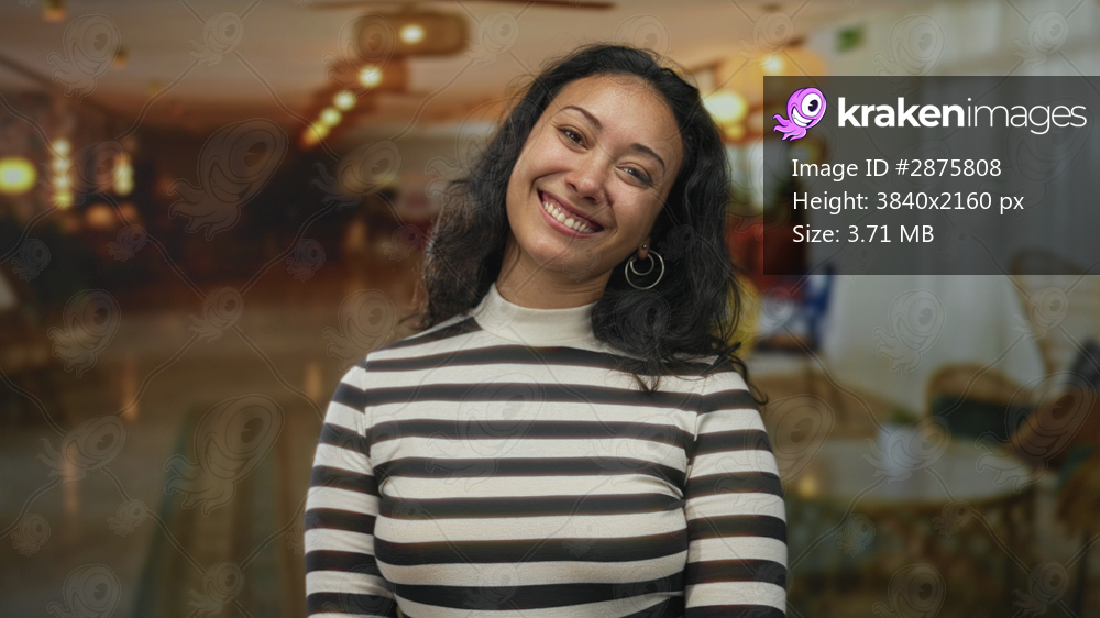 Woman smiling with face and head tilt, eyes closed, wearing striped top in hotel building lobby with warm lights and chairs; contentment ease.