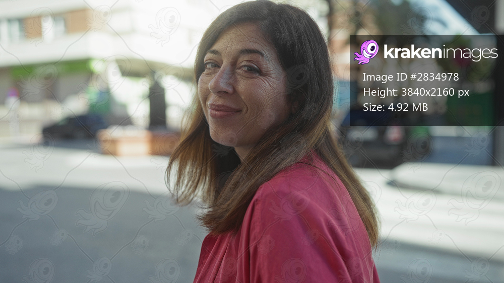Woman smiling face near parked car on city street with soft sunlight illuminating her expression; contentment.