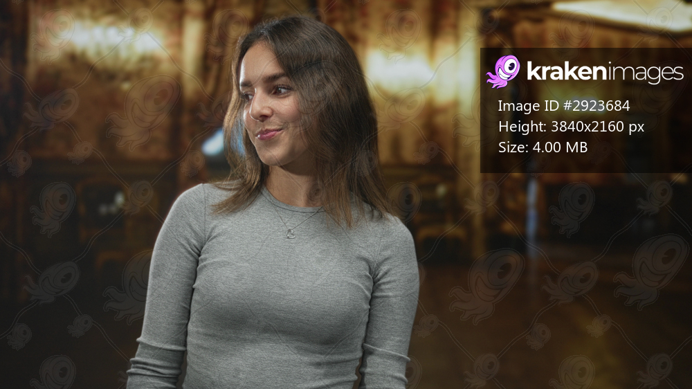 Woman smiling with face turned to the side and heart necklace visible in an ornate museum hall; contentment.