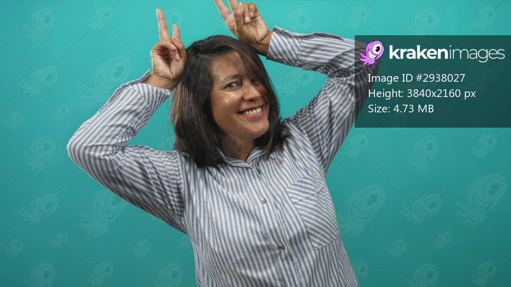 Woman smiling with face visible and hands forming peace sign in studio with striped shirt and teal backdrop; playful joy.