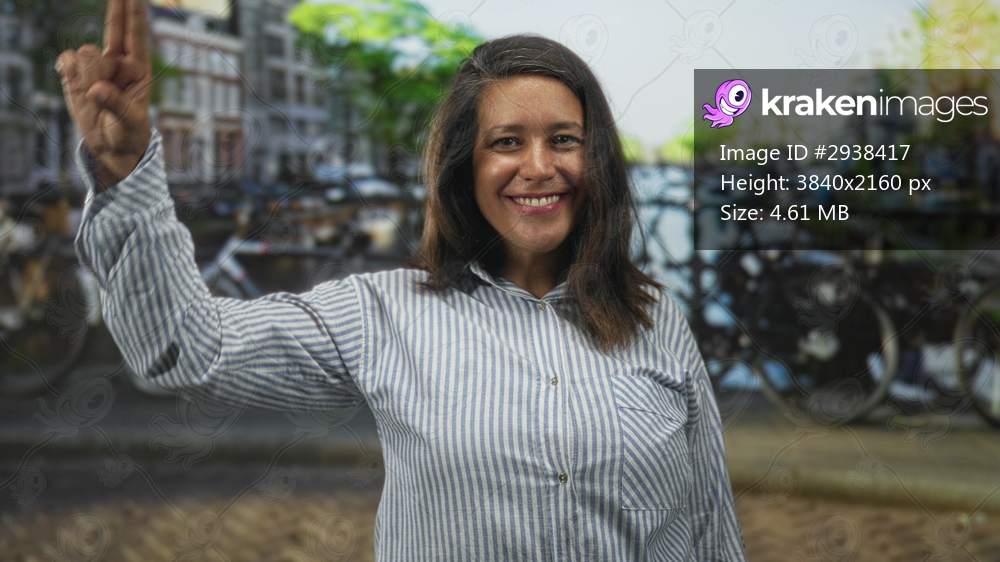 Woman smiling with face visible, head tilt, standing by bicycles and bridge near canal on street, wearing striped button shirt and casual collar; joy travel memory. - Kraken Images