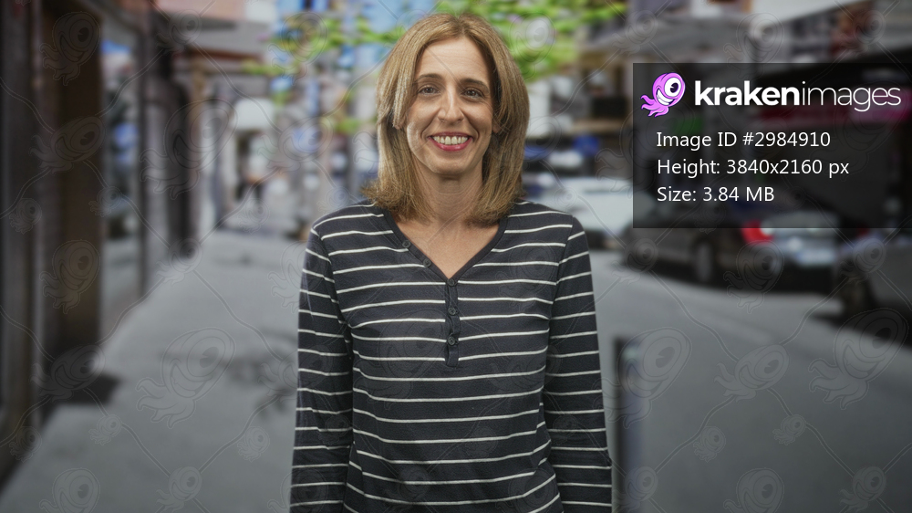 Woman smiling, face visible on street, wearing striped top and standing near parked cars and sidewalk; contentment everyday life.