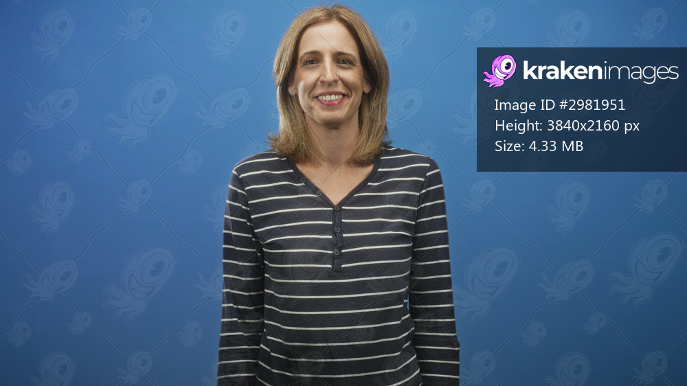 Woman smiling, face visible and wearing striped long sleeve shirt in studio with plain blue backdrop; friendly.