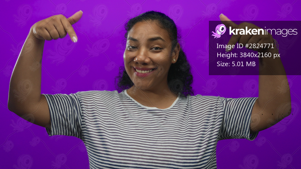 Woman smiling and finger pointing downward in studio against a vivid purple backdrop offering a clear focus point; attention.