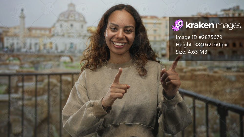 Woman smiling with finger pointing to camera in ancient roman building overlooking ruins and railing; joy travel discovery.