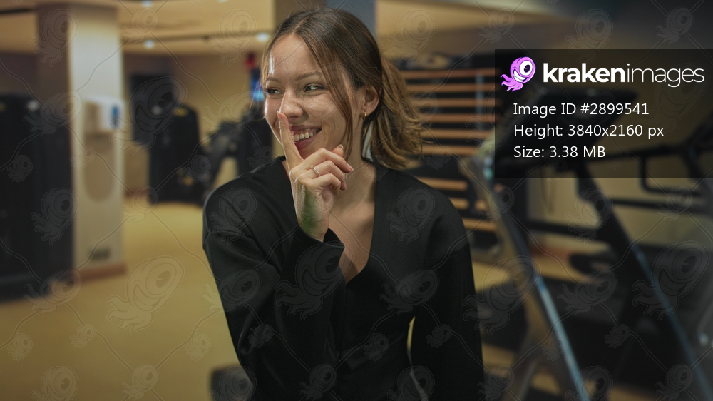 Woman smiling with finger to lips for silence inside a gym studio near treadmills and fitness equipment, seated and relaxed; playful.