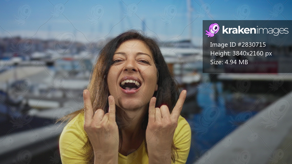 Woman smiling with fingers in a rock horns gesture by the seaside on a street walkway near moored boats; fun.
