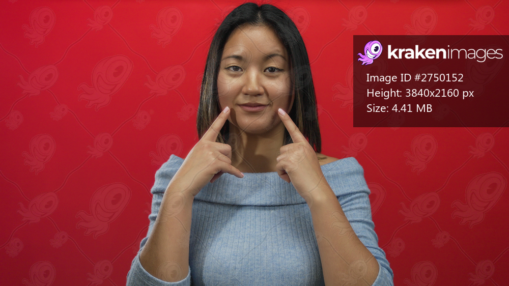 Woman smiling with fingers on cheeks in front of a vibrant red wall, young happy female wearing light blue sweater against isolated background, showcasing joy and positivity. - Kraken Images