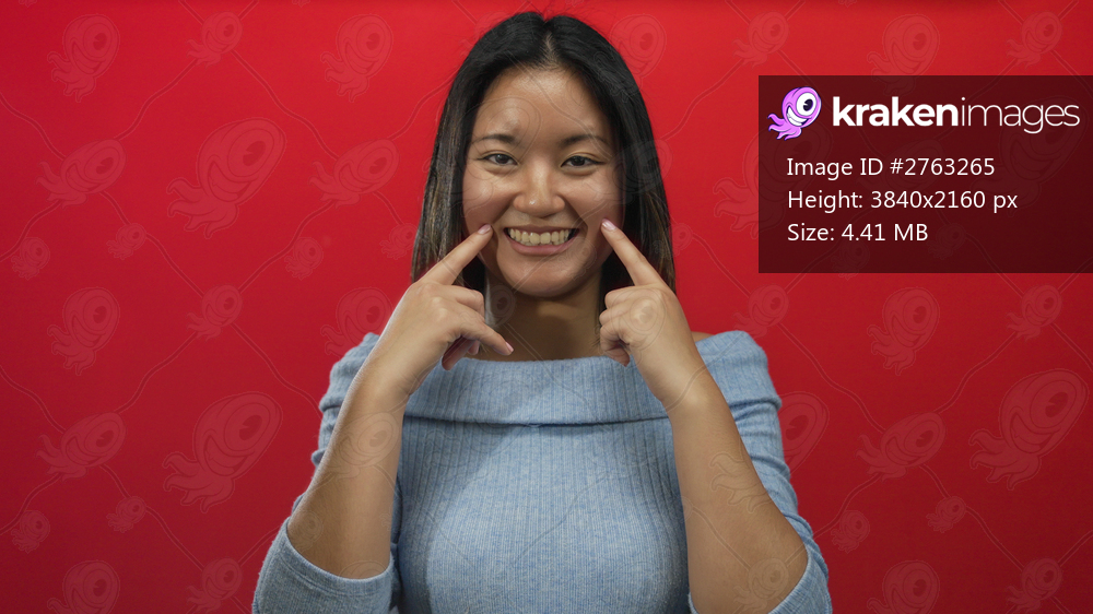 Woman smiling with fingers on cheeks in front of a vibrant red wall, young happy female wearing light blue sweater against isolated background, showcasing joy and positivity. - Kraken Images
