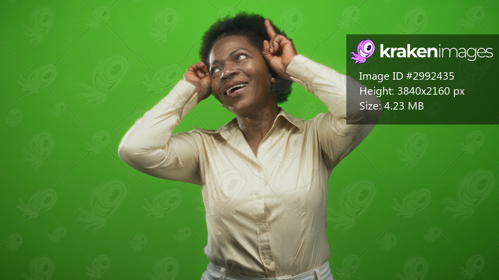 Woman smiling, fingers pointed to temples with elbows raised, wearing beige button shirt against green screen in studio; joy.