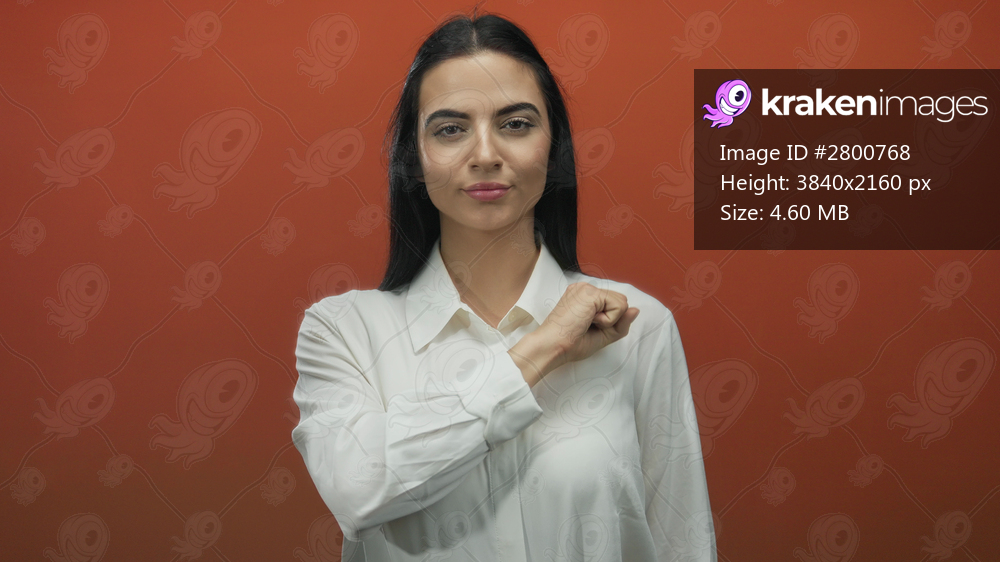 Woman smiling with fist raised against vibrant red wall suggests empowerment and confidence with expressive pose and casual attire.
