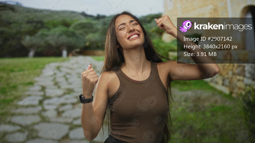 Woman smiling with fists raised on a paved path beside a stone building and grassy field in the countryside; joy triumph success.