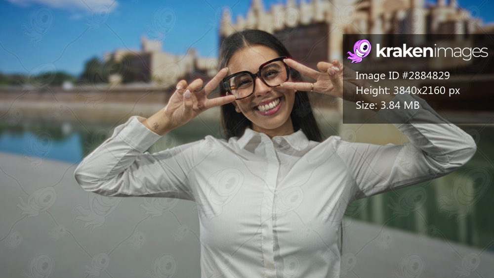 Woman smiling and flashing peace sign with both hands near face while wearing large glasses and white shirt in front of an old stone building by water on street; joy playful energy. - Kraken Images