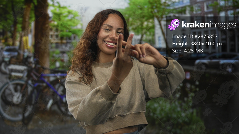 Woman smiling and forming a hashtag with fingers on a canal street in amsterdam in a cropped sweater; social connection joy community.