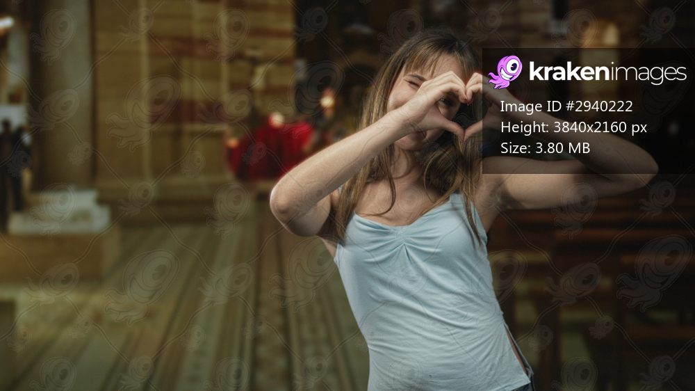 Woman smiling and forming a heart with hands at chest inside a church building near wooden pews and altar; love faith hope.