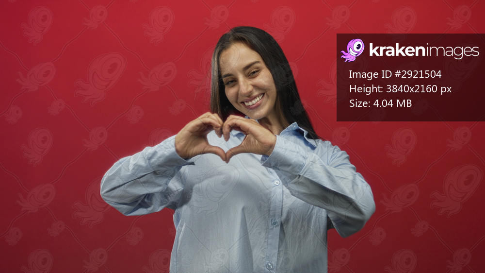 Woman smiling forming heart with hands in red studio wearing blue oversized shirt; joy love warmth kindness.