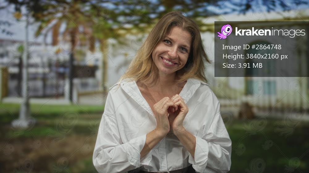 Woman smiling forms heart shape with hands near chest in green park beside a white building with arched windows; gentle serenity.