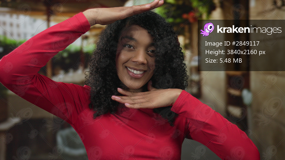 Woman smiling frames face with hands on outdoor terrace of stone building while wearing red top and curly hair flowing; playfulness.