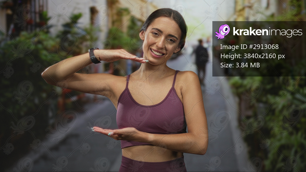 Woman smiling and framing empty space with hands, bare arms visible, wearing purple crop top on narrow city street lined with plants; confidence wellbeing. - Kraken Images