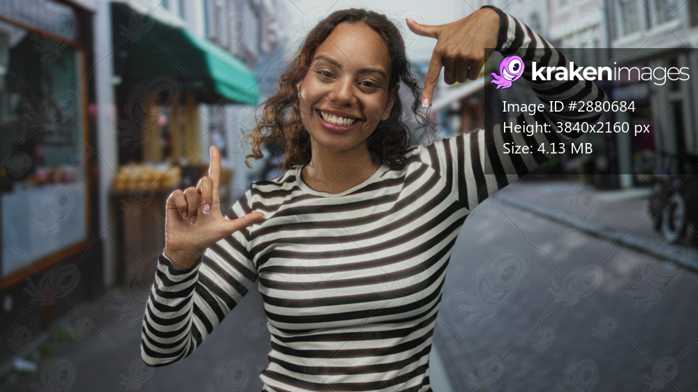 Woman smiling and framing face with fingers while forming l shapes with both hands on a cobbled city street; joyful confidence play.