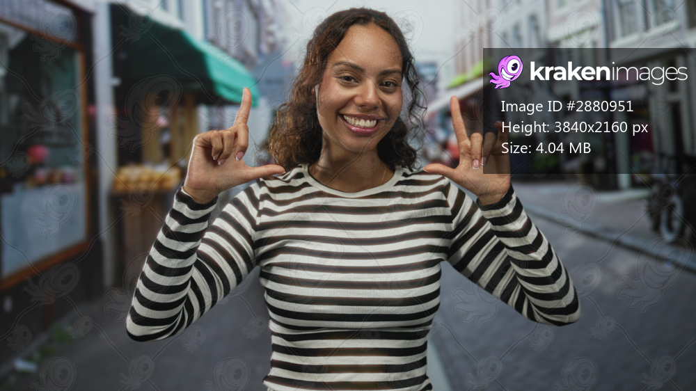 Woman smiling and framing face with fingers while forming l shapes with both hands on a cobbled city street; joyful confidence play.