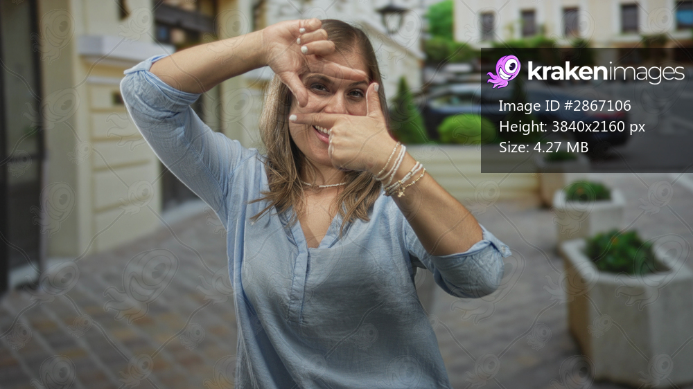 Woman smiling and framing with fingers and thumbs on sunlit street with potted planter and parked car; vision creativity.