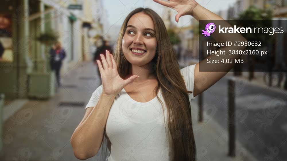 Woman smiling and framing her face with both hands on a busy city street while looking right; happiness confidence.
