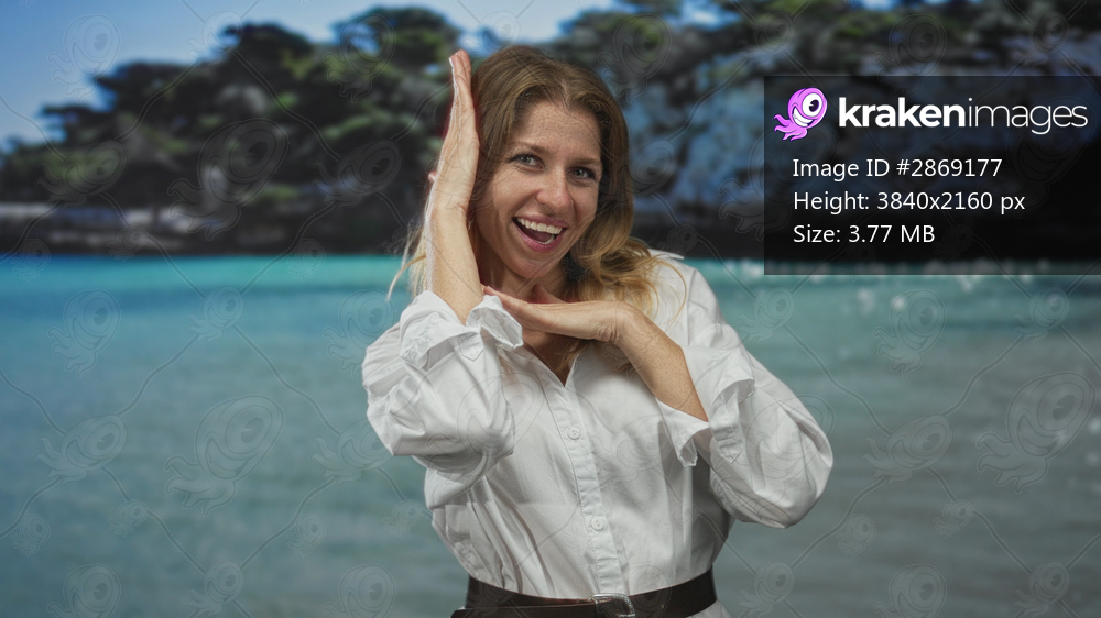 Woman smiling and framing her face with hands in a studio beach set while winking and waving; joyful playfulness.