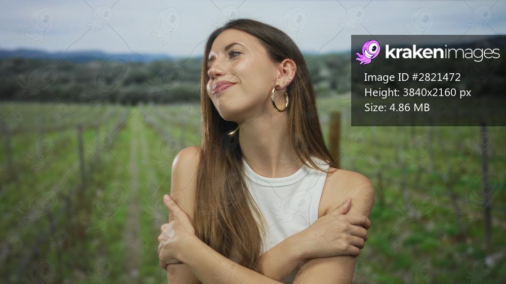 Woman smiling gently and hugging shoulders with bare arms in sunlit lush forest clearing; serenity comfort warmth acceptance.