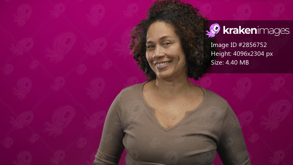 Woman smiling gently in well lit studio with magenta background;self acceptance happiness positivity.