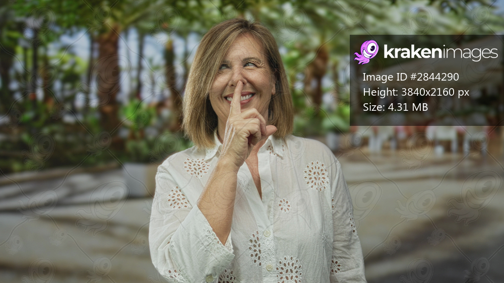Woman smiling gently in white blouse puts finger to lips for silence in sunlit green park; quiet calm hush.