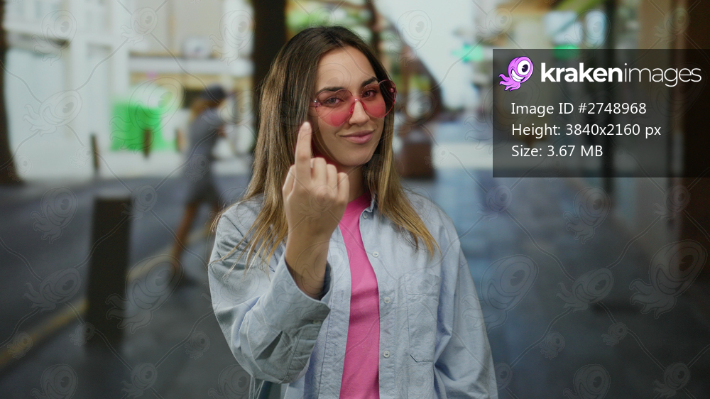 Woman smiling and gesturing come with her finger on a sunny street wearing sunglasses and a casual shirt showcasing a playful inviting demeanor in an urban outdoor setting. - Kraken Images
