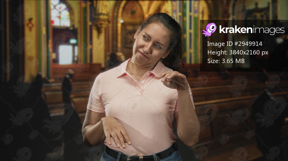 Woman smiling and gesturing with hands among wooden church pews and stained glass windows inside a church building; serenity.