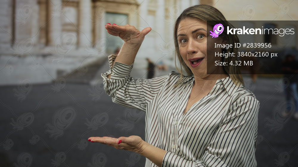 Woman smiling and gesturing with hands on historic town street; happiness connection sharing culture.