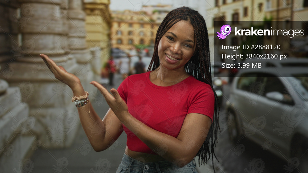 Woman smiling and gesturing with hands and open palms while wearing a red crop top on a cobbled street with cars; joy travel.