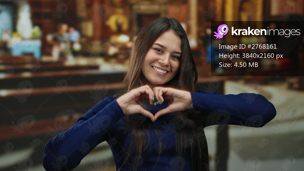 Woman smiling and gesturing heart with hands inside church, suggesting a positive and heartfelt emotion in a sacred setting, attracting attention in the serene indoor environment. - Kraken Images