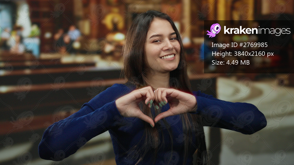 Woman smiling and gesturing heart with hands inside church, suggesting a positive and heartfelt emotion in a sacred setting, attracting attention in the serene indoor environment. - Kraken Images