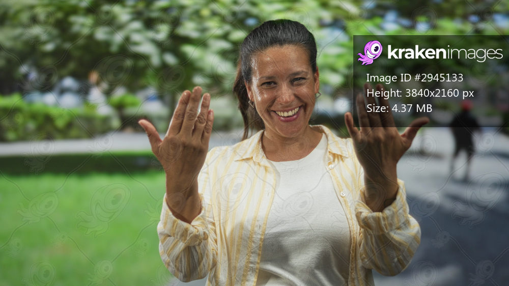 Woman smiling and gesturing with open palms on a street walkway under trees and sunlight; warmth welcome joy.