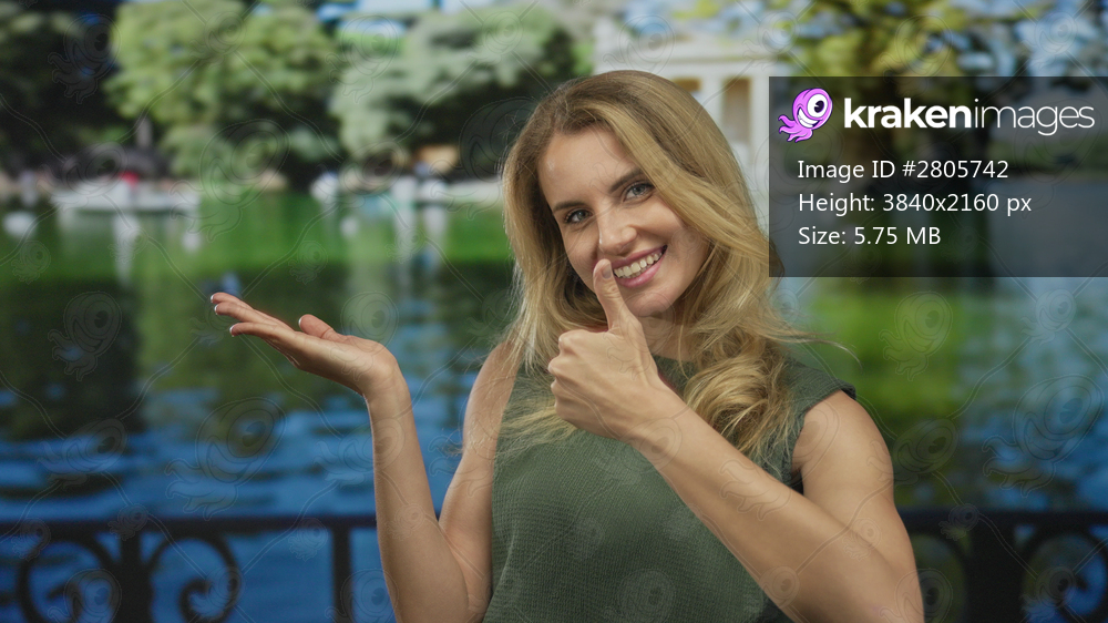 Woman smiling and gesturing thumbs up while extending a hand, standing in a green outdoor park with lush trees and reflecting water.