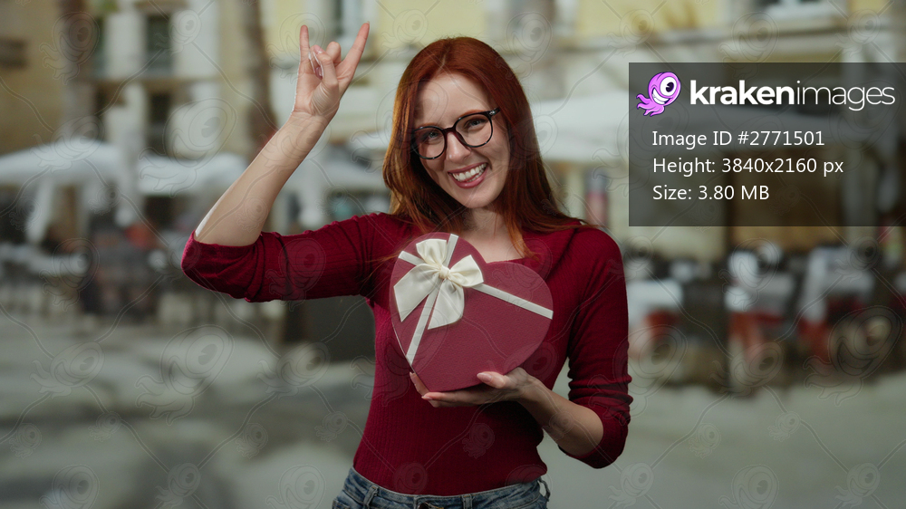 Woman smiling with gift on terrace, wearing glasses and red shirt, expressing joy outdoors at city restaurant.
